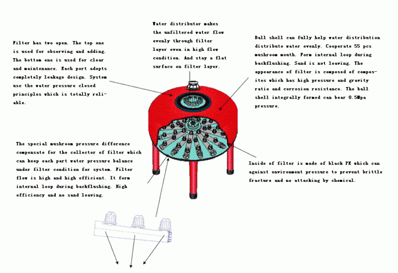 The special mushroom pressure difference compensate for the collector of filter which can keep each part water pressure balance under filter condition for system. Filter flow is high and high efficient. It form internal loop during backflushing. High efficiency and no sand leaving.