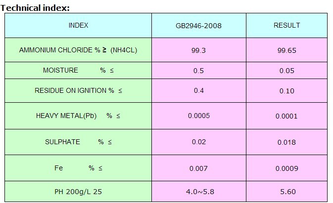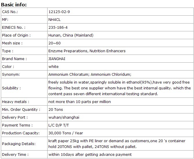 Package : kraft paper 25kg with PE liner Ammonium chloride can be made by the chemical reaction , that is NH3+ HCI=NH4CI, which can get the cubiccrystal or white powder, and that is the rudiment of ammonium chloride. We used this as material and deducethe scaps,Ammonium chloride can be widely used in medicine, feed additive ,smelting, chemistry analysis.we expert in producing the high purity,quality and precision ammonium chloride,Handling and Storage:1. Store in a cool, dry, ventilated house away from moisture.2. Avoid handling or transporting together with acidic or alkaline substances.3. Prevent the material from rain and insolation. Load and unload carefully and protect from package damage.4. In the event of a fire, use water, soil or Carbon Dioxide Fire Extinguishing Media.