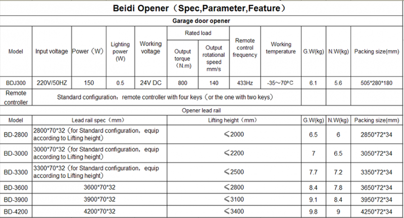 Description:Product Introduction: ①LED Chinese and English menu. ②Voice menu navigation system. ③Wireless anti-tamper alarm function. (can be connected to house alarm system) ④Password keyboard lock with remote control. ⑤Nine-level delay automatic shutting function. ⑥Stroke fine tuning, soft start and slow stop function. ⑦The power of door open and close can be detected automatically. ⑧Overloading protection display, the door will be turned back if meets resistance when close, and will stop if meets resistance when open. ⑨12V built-in back up battery access port. (24V backup battery access port for BDJ1000) ⑩Clutch automatic reset, rail with prying prevention function, 433HZ rolling-code remote control technology, sensitive, no coincident code, high security.
