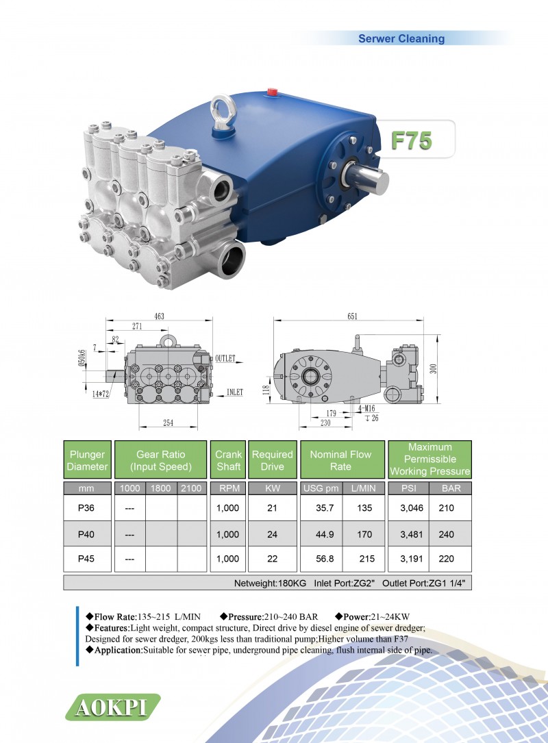 Key words: High pressure pump, sewer pump, plunger pump, reciprocating pump, water cleaning pump, pressure testing pump, hydrostatic testing pump, piston pump, surface pump Flow rate: >100 L/min Pressure: > 200bar Input power: 117KW Feature: Power ratings up to 117KW (160HP) Flow rate up to 215 L/min (56 GPM) Pressure up to 220 bar (3190 Psi) Input speed: 1000 RPM Light weight, compact structure, Direct drive by diesel engine of sewer dredger; Designed for sewer dredger, 200kgs less than traditional pump; Higher volume than F37 Application: Suitable for sewer pipe, underground pipe cleaning, flush internal side of pipe.